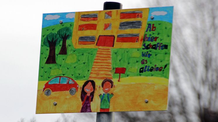 Bunte große Fußspuren zeigen den Schülern der Grundschule am Blumenhag den sicheren Weg von den Parkplätzen in der Straße Am Blumenhag zu ihrer Schule. Farbenfrohe Schilder weisen den Eltern die Haltestellen, die sie morgens ansteuern können, wenn sie ihre Kinder zur Schule fahren. In Bernau bei Berlin wurde heute die erste Elternhaltestelle im Landkreis Barnim offiziell in Betrieb genommen. „Die Situation vor vielen Schulen ist morgens oft chaotisch und gefährlich. Wir freuen uns deshalb darüber, dass wir mit dieser Maßnahme dazu beitragen können, den Schulweg wieder ein Stück sicherer zu machen“, so Michaela Waigand, stellvertretende Bürgermeisterin der Stadt Bernau.