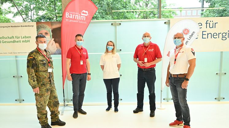 Freuen sich über die Fortsetzung einer gelungenen Kooperation (v.l.): Stabsfeldwebel Andreas Weidemeier (Bundeswehr), Claudius Kaczmarek (Geschäftsführer Rettungsdienst Landkreis Barnim GmbH), Jessica Engmann (JUH, operative Leiterin des Eberswalder Impfzentrums), Landrat Daniel Kurth (Landkreis Barnim) und Ralf Opitz (Regionalvorstand beim Johanniter Regionalverband Nordbrandenburg).