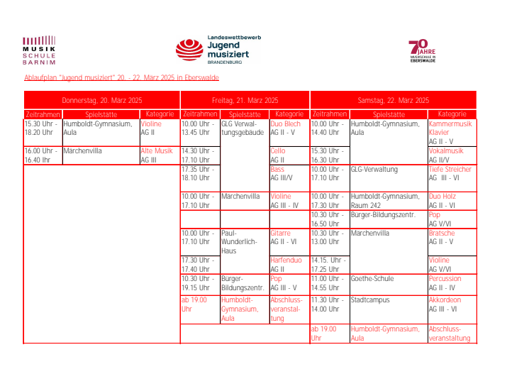 Die Wettbewerbsvorspiele finden an sieben verschieden Spielstätten statt: im Paul-Wunderlich-Haus (Freitag, 21.03.), dem Bürgerbildungszentrum Amadeo Antonio BBZ (Freitag und Samstag, 21./22.03.) der Märchenvilla Eberswalde (Donnerstag - Samstag, 20.-22.03.), im Konferenzsaal der GLG (Freitag und Samstag, 21./22.03.), im Humboldt-Gymnasium (Donnerstag-Samstag, 20.-22.03.), der Goethe-Schule (Samstag, 22.03.) und der Alten Forstakademie (Samstag, 22.03.). Nähere Infos und Zeitpläne sind zu finden auf der Homepage der Musikschule Barnim und unter jumu-brandenburg.de.