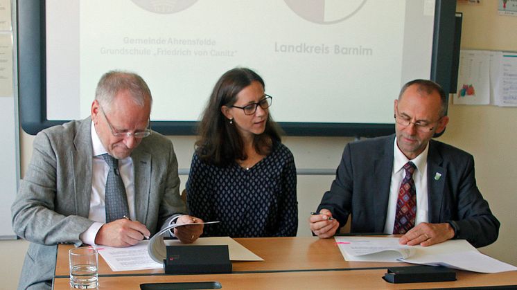 Der Landkreis Barnim und die Gemeinde Ahrensfelde haben eine öffentlich-rechtliche Vereinbarung zur Übernahme der Blumberger Grundschulstandort durch den Landkreis geschlossen. Landrat Bodo Ihrke und Bürgermeister Wilfried Gehrke unterzeichneten die Vereinbarung am Freitag im Beisein von Schulleiterin Patricia Franke.