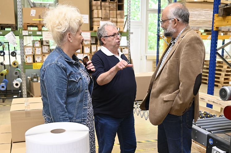 Bürgermeisterin Astrid Hildebrand und Landrat Daniel Kurth im Gespräch mit Matthias Schach, Geschäftsführer der Bindfadenhaus en gros Gustav Scharnau GmbH.