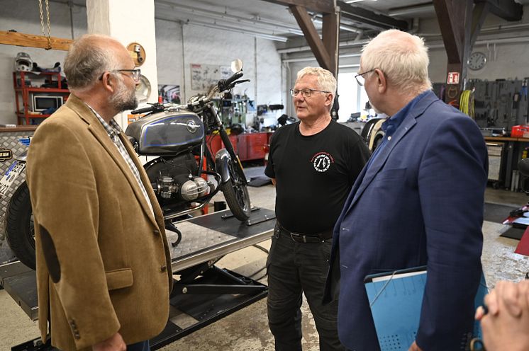 Besuch der Motorradhalle Thäle, wo Gründer Dietmar Thäle (m.) aus der Entwicklung seines Handwerksbetriebes berichtete.