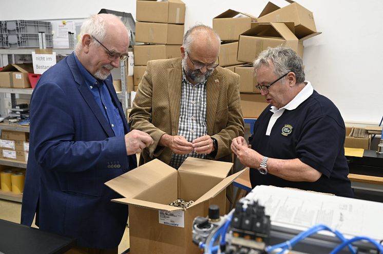 Matthias Schach (r.), Geschäftsführer der Bindfadenhaus en gros Gustav Scharnau GmbH, führte Landrat Daniel Kurth (m.) und WITO-Geschäftsführer Bernd Christoph Skudelny durch seinen Betrieb.