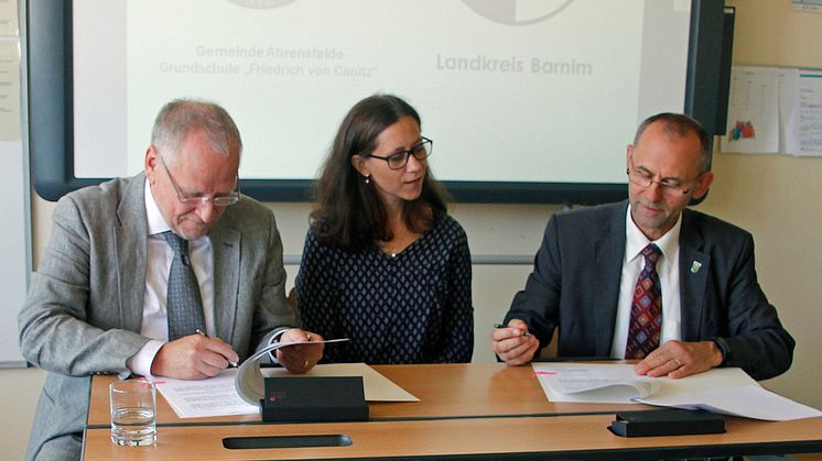 Der Landkreis Barnim und die Gemeinde Ahrensfelde haben eine öffentlich-rechtliche Vereinbarung zur Übernahme der Blumberger Grundschulstandort durch den Landkreis geschlossen. Landrat Bodo Ihrke und Bürgermeister Wilfried Gehrke unterzeichneten die Vereinbarung am Freitag im Beisein von Schulleiterin Patricia Franke.